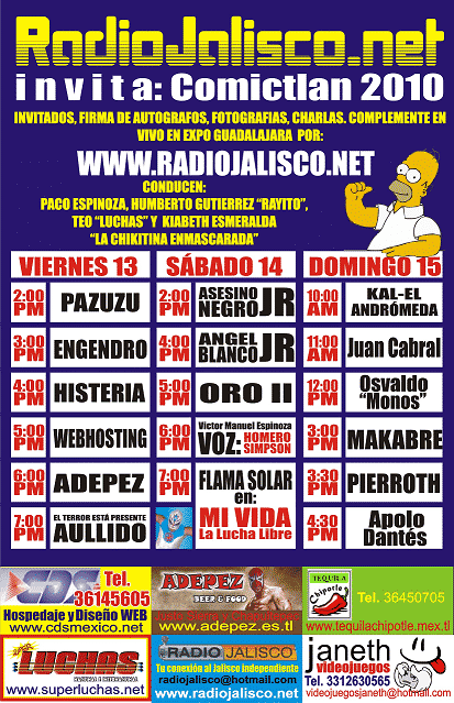 Celebrando el XV aniversario de Comictlan, Súper Luchas y Radiojalisco.net, presentarán del 13 al 15 de agosto una edición especial de su programación con la presencia de varias estrellas de la lucha libre nacional, entre ellos: Apolo Dantés, Pierroth, Histeria, Adepez, además del empresario Juan Cabral y el locutor Víctor Manuel Espinoza, la otra voz de Homero Simpson.