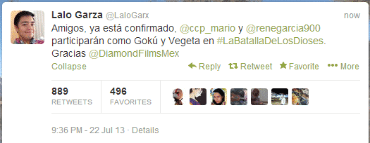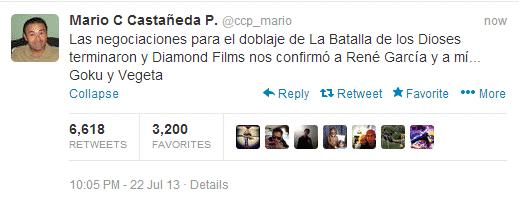 Esto a raíz de que el propio Mario Castañeda confirmo vía Twitter que no había sido llamado por la casa productora, y fue por este mismo medio que dio la gran y hermosa noticia que participaría dando la voz de Goku. También hablamos de la voz de Piccolo (Carlos Segundo), Krillin (Lalo Garza, que también será el director de doblaje) y Vegeta (Rene García).