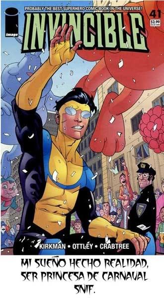 Me he leido INVINCIBLE, y es un comics muy bueno, sobre todo los primeros numeros, ¿de que va? es fácil explicarlo, supongan que Superman tiene un hijo, y ese hijo en la adolescencia descubre que aparte de los cambios fisicos y de voz, tambien debe preocuparse ahora por tener superpoderes, de llevar una doble vida, como superheroe juvenil, lo que nos trae situaciones muy a los primeros años de Peter Parker como Spiderman.